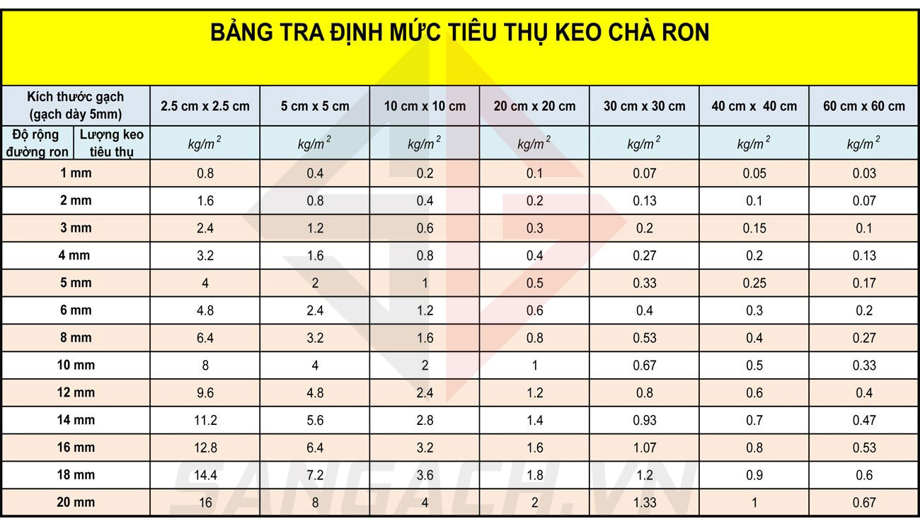 Để tính định mức keo chà ron gạch chính xác, bạn có thể sử dụng bảng tra định mức tiêu thụ cho diện tích nhỏ hoặc công thức tính định mức cho diện tích lớn.